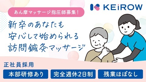 | 待遇 | ・交通費支給有(20,000円まで) ・社会保険加入あり(健康保険、厚生年金、雇用保険、労災保険) ・施術賠償責任保険加入(KEiROWで加入) ・ユニフォーム(施術着)貸与 ・社用車貸し出し(バイク、自転車、車など、店舗によって応相談) ・資格取得制度(KEiROW機能訓練認定士・誤嚥訓練サポーター) ・自主学習システム(24時間、施術動画の視聴が可能♪) ・奨学金返還支援制度 KEiROWでは奨学金返還者を応援、サポートする制度があります。 詳細についてはKEiROW本部へお問い合わせください。 【KEiROW本部研修参加】 ・施術家向け初期研修(手技・座学) ※訪問初めての方やブランクがある方にはオススメしてます ・加盟店研修(本部在籍の施術家が店舗へ伺います) ・店舗にて施術同行研修 KEiROW本部では、施術家の方を対象に3日間(※)の初期研修を実施しています。 研修後は、店舗で先輩施術家の施術に同行し、実際の業務の流れを学んでいただきます。 ビジネスマナーから基礎手技まで丁寧に指導いたしますので、未経験の方やブランクのある方、新卒の方も安心してスタートできます。 ※研修期間は鍼灸師は4日、新卒は5日になる場合があります。 ※KEiROWはフランチャイズチェーンのため、店舗によって異なる場合がございます。詳細についてはお問い合わせください。 【社会保険】 ・厚生年金 ・健康保険 ・雇用保険 ・労災保険 【受動喫煙対策】 ・屋内禁煙 |